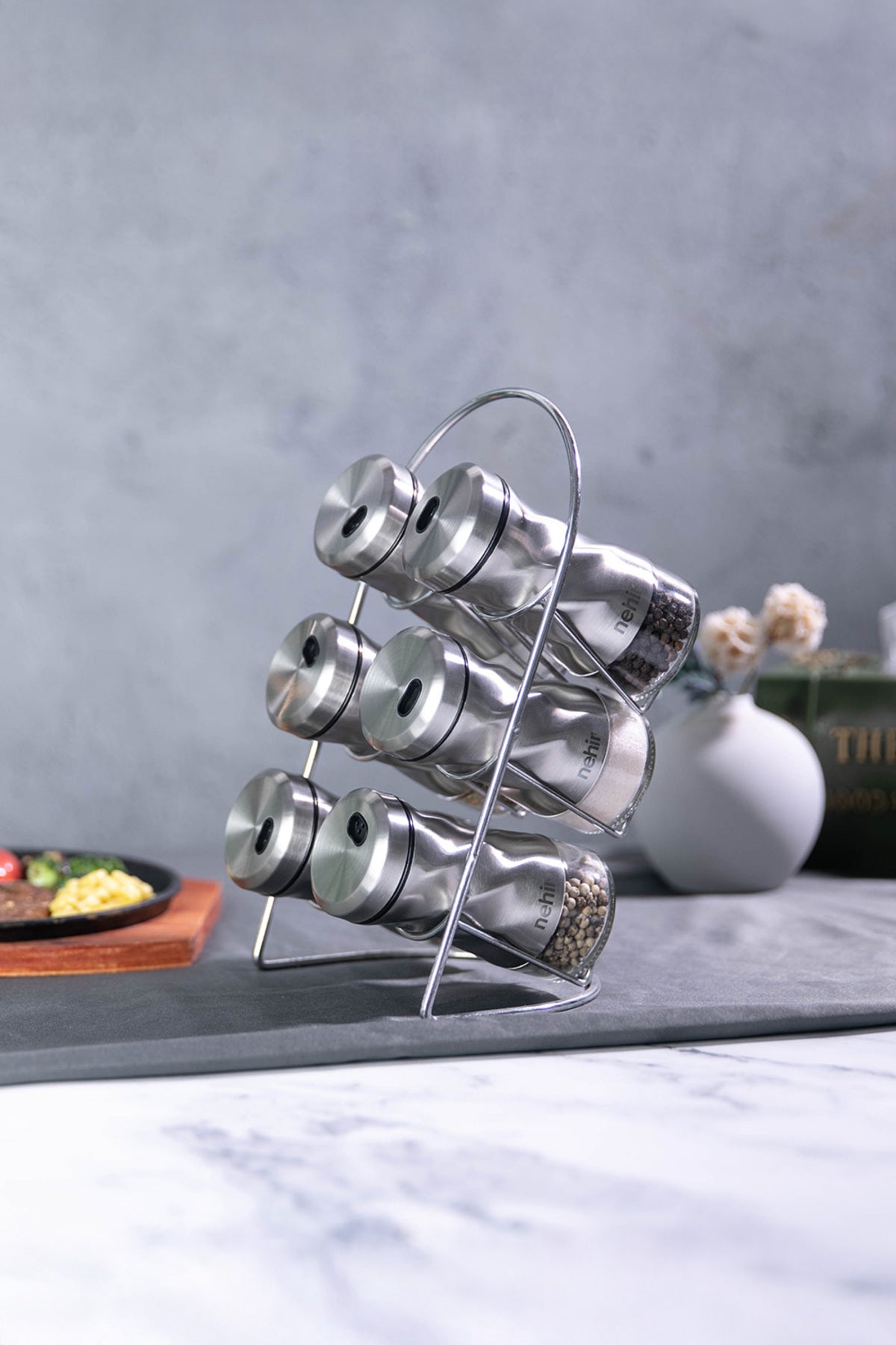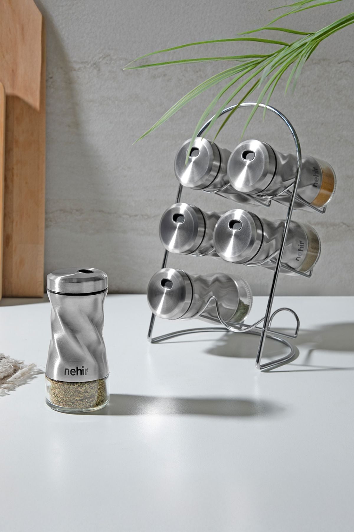 Burgulu Standlı 6 Parça Paslanmaz Çelik Baharatlık Seti